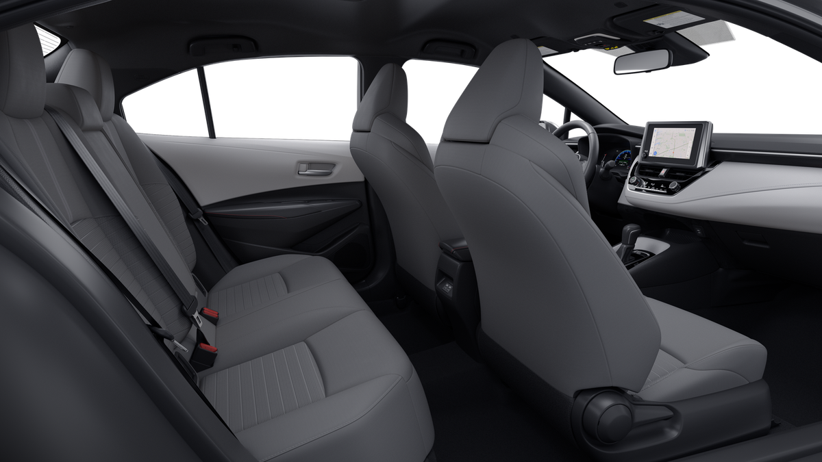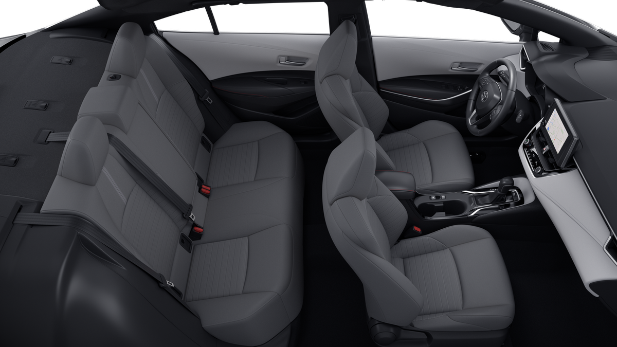 , SAFETY FEATURES, AUDIO FEATURES, COMFORT AND CONVENIENCE, EXTERIOR FEATURES, ADDITIONAL FEATURES. All Weather Floor Liner Package, 4-Wheel Disc Brakes, 6 Speakers, ABS brakes, Air Conditioning, Alloy wheels, AM/FM radio: SiriusXM, Apple CarPlay/Android Auto, Auto High-beam Headlights, Automatic temperature control, Brake assist, Bumpers: body-color, Delay-off headlights, Driver door bin, Driver vanity mirror, Dual front impact airbags, Dual front side impact airbags, Electronic Stability Control, Emergency communication system: Safety Connect (up to 10-year trial subscription), Exterior Parking Camera Rear, Fabric Seat Trim, Four wheel independent suspension, Front anti-roll bar, Front Bucket Seats, Front Center Armrest, Front reading lights, Front Sport Seats, Fully automatic headlights, Heated door mirrors, Illuminated entry, Knee airbag, Leather steering wheel, Low tire pressure warning, Occupant sensing airbag, Outside temperature display, Overhead airbag, Panic alarm, Passenger door bin, Passenger vanity mirror, Power door mirrors, Power steering, Power windows, Radio data system, Radio: 8 Toyota Audio Multimedia, Rear anti-roll bar, Rear seat center armrest, Rear side impact airbag, Rear window defroster, Remote keyless entry, Speed control, Split folding rear seat, Spoiler, Steering wheel mounted audio controls, Tachometer, Telescoping steering wheel, Tilt steering wheel, Traction control, Trip computer, Turn signal indicator mirrors, Variably intermittent wipers, and Wheels: 18 Alloy with Graphite-Colored Finish. 31/38 City/Highway MPG