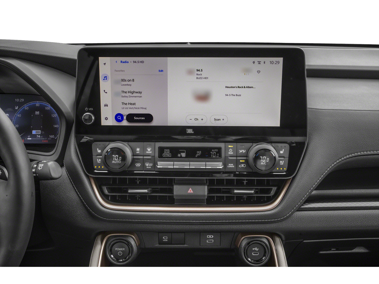 , SAFETY FEATURES, AUDIO FEATURES, COMFORT AND CONVENIENCE, EXTERIOR FEATURES, ADDITIONAL FEATURES, 2.4L 4-Cylinder. 2.4L 4-Cylinder, 11 Speakers, 3rd row seats: split-bench, 4-Wheel Disc Brakes, ABS brakes, Air Conditioning, All Weather Floor Liners/Cargo Tray, Alloy wheels, AM/FM radio: SiriusXM, Apple CarPlay/Android Auto, Auto High-beam Headlights, Auto-dimming Rear-View mirror, Automatic temperature control, Brake assist, Bumpers: body-color, Delay-off headlights, Door Edge Guards, Driver door bin, Driver vanity mirror, Dual front impact airbags, Dual front side impact airbags, Electronic Stability Control, Emergency communication system: Safety Connect (up to 10-year trial subscription), Exterior Parking Camera Rear, Four wheel independent suspension, Front anti-roll bar, Front Bucket Seats, Front Center Armrest, Front dual zone A/C, Front fog lights, Front reading lights, Fully automatic headlights, Garage door transmitter: HomeLink, Heads-Up Display, Heated and Ventilated Front Seats, Heated door mirrors, Heated front seats, Heated rear seats, Heated steering wheel, Illuminated entry, Knee airbag, Leather Shift Knob, Leather steering wheel, Logo Side Puddle Lamps, Low tire pressure warning, Memory seat, Mudguards, Multimedia Glass Screen Protector, Navigation system: Drive Connect Cloud Navigation (1-year trial subscription), Occupant sensing airbag, Outside temperature display, Overhead airbag, Overhead console, Panic alarm, Passenger door bin, Passenger vanity mirror, Power door mirrors, Power driver seat, Power Liftgate, Power moonroof, Power passenger seat, Power steering, Power windows, Premium Paint, Radio: 12.3 Toyota Audio Multimedia with JBL Audio, Rain sensing wipers, Rear air conditioning, Rear anti-roll bar, Rear reading lights, Rear window defroster, Rear window wiper, Reclining 3rd row seat, Remote keyless entry, Security system, Speed control, Speed-sensing steering, Split folding rear seat, Spoiler, Steering wheel mounted audio controls, Telescoping steering wheel, Tilt steering wheel, Traction control, Trip computer, Turn signal indicator mirrors, Ultrasuede/Leather Seat Trim, Variably intermittent wipers, Ventilated front seats, Ventilated rear seats, and Wheels: 20 2-Tone Multi-Spoke Aluminum. 26/27 City/Highway MPG