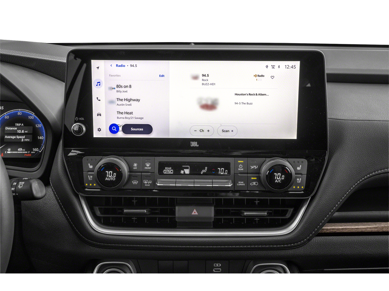 , SAFETY FEATURES, AUDIO FEATURES, COMFORT AND CONVENIENCE, EXTERIOR FEATURES, ADDITIONAL FEATURES. 11 Speakers, 3rd row seats: split-bench, 4-Wheel Disc Brakes, ABS brakes, Air Conditioning, All Weather Floor Liners/Cargo Tray, Alloy wheels, AM/FM radio: SiriusXM, Apple CarPlay/Android Auto, Auto High-beam Headlights, Auto-dimming Rear-View mirror, Automatic temperature control, Brake assist, Bumpers: body-color, Delay-off headlights, Driver door bin, Driver vanity mirror, Dual front impact airbags, Dual front side impact airbags, Electronic Stability Control, Emergency communication system: Safety Connect (up to 10-year trial subscription), Exterior Parking Camera Rear, Four wheel independent suspension, Front anti-roll bar, Front Bucket Seats, Front Center Armrest, Front dual zone A/C, Front fog lights, Front reading lights, Fully automatic headlights, Garage door transmitter: HomeLink, Heated and Ventilated Front Seats, Heated door mirrors, Heated front seats, Heated rear seats, Heated steering wheel, Illuminated Door Sills, Illuminated entry, Knee airbag, Leather Seat Trim, Leather Shift Knob, Leather steering wheel, Low tire pressure warning, Memory seat, Mudguards, Navigation system: Drive Connect Cloud Navigation (1-year trial subscription), Occupant sensing airbag, Outside temperature display, Overhead airbag, Overhead console, Panic alarm, Panoramic View Monitor, Passenger door bin, Passenger vanity mirror, Power door mirrors, Power driver seat, Power Liftgate, Power passenger seat, Power steering, Power Tilt/Slide Panoramic Rood with Power Sunshade, Power windows, Radio: 12.3 Toyota Audio Multimedia with JBL Audio, Rain sensing wipers, Rear air conditioning, Rear anti-roll bar, Rear reading lights, Rear window defroster, Rear window wiper, Reclining 3rd row seat, Remote keyless entry, Security system, Speed control, Speed-sensing steering, Split folding rear seat, Spoiler, Steering wheel mounted audio controls, Tachometer, Telescoping steering wheel, Tilt steering wheel, Tow Hitch, Traction control, Trip computer, Turn signal indicator mirrors, Variably intermittent wipers, Ventilated front seats, and Wheels: 20 Silver Multi-Spoke Aluminum. 20/26 City/Highway MPG