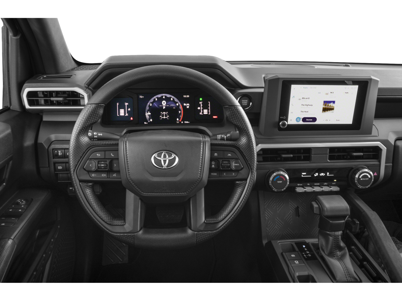 , SAFETY FEATURES, AUDIO FEATURES, COMFORT AND CONVENIENCE, EXTERIOR FEATURES, ADDITIONAL FEATURES. 17 Steel Wheels, 3.583 Axle Ratio, 4 Speakers, 4-Wheel Disc Brakes, ABS brakes, Air Conditioning, All Weather Floor Liners, AM/FM radio: SiriusXM, Anti-whiplash front head restraints, Apple CarPlay/Android Auto, Auto High-beam Headlights, Black Badge Overlay, Black Tailgate Insert, Brake assist, Bumpers: body-color, Driver door bin, Dual front impact airbags, Dual front side impact airbags, Electronic Stability Control, Emergency communication system: Safety Connect (up to 10-year trial subscription), Exterior Parking Camera Rear, Fabric Seat Trim, Front anti-roll bar, Front Bucket Seats, Front Center Armrest, Front reading lights, Front wheel independent suspension, Fully automatic headlights, Heated door mirrors, Illuminated entry, Knee airbag, Low tire pressure warning, Occupant sensing airbag, Outside temperature display, Overhead airbag, Overhead console, Passenger door bin, Power door mirrors, Power steering, Power windows, Radio: 8 Toyota Audio Multimedia, Rear step bumper, Rear window defroster, Remote keyless entry, Speed control, Speed-sensing steering, Spray-on Bed Liner, Steering wheel mounted audio controls, Tachometer, Telescoping steering wheel, Tilt steering wheel, Traction control, Trip computer, USB Rear Power Port, and Variably intermittent wipers. 20/26 City/Highway MPG