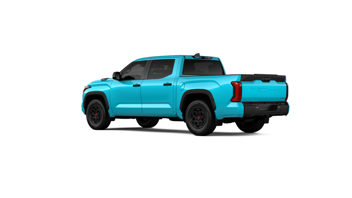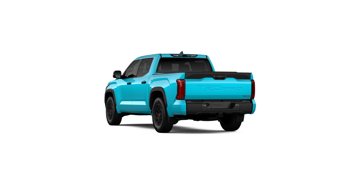 - "TRD PRO" hood badge; black door handles; black window molding and mirror caps; black technical-camo-grained tailgate spoiler and overfenders with marker lights