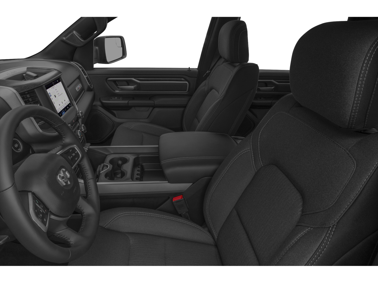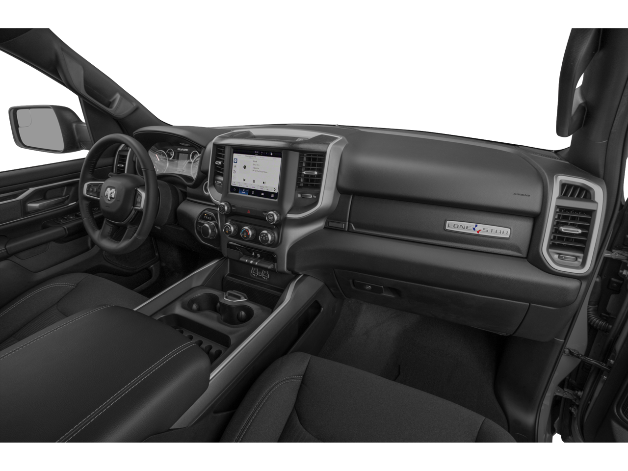 , SAFETY FEATURES, AUDIO FEATURES, COMFORT AND CONVENIENCE, EXTERIOR FEATURES, ADDITIONAL FEATURES. Big Horn Level 2 Equipment Group (115V Auxiliary Power Outlet, 115V Auxiliary Rear Power Outlet, 2nd Row In Floor Storage Bins, 400W Inverter, 4G LTE Wi-Fi Hot Spot, 8.4 Touchscreen Display, Air Conditioning ATC w/Dual Zone Control, Apple CarPlay, Auto-Dimming Exterior Driver Mirror, Auto-Dimming Rear-View Mirror, Black Exterior Mirrors, Black Premium Power Mirrors, Bluetooth® Handsfree Phone & Audio, Class IV Receiver Hitch, Cluster 7.0 TFT Color Display, Connectivity - US/Canada, Convex Wide-Angle Mirror Insert, Exterior Mirrors Courtesy Lamps, Exterior Mirrors w/Heating Element, Exterior Mirrors w/Supplemental Signals, For Details, Visit DriveUconnect.com, Global Telematics Box Module (TBM), Glove Box Lamp, Google Android Auto, GPS Antenna Input, Heated Front Seats, Heated Steering Wheel, Integrated Center Stack Radio, Media Hub w/2 Charge Only USBs, ParkSense Front/Rear Park Assist w/Stop, Power 2-Way Driver Lumbar Adjust, Power 8-Way Driver Seat, Power Adjustable Pedals, Power-Folding Mirrors, Radio: Uconnect 5 W w/8.4 Display, Rear Dome w/On/Off Switch Lamp, Rear Power Sliding Window, Rear Window Defroster, Remote Start System, Security Alarm, SiriusXM Radio Service, SiriusXM Satellite Radio, Sun Visors w/Illuminated Vanity Mirrors, Universal Garage Door Opener, and USB Host Flip), Quick Order Package 23Z Big Horn (Big Horn Badge), 3 Rear Seat Head Restraints, 3.21 Rear Axle Ratio, 4 Way Front Headrests, 4-Wheel Disc Brakes, 48V Belt Starter Generator, 6 Speakers, 9 Amplified Speakers w/Subwoofer, ABS brakes, Air Conditioning, All R1 High Radios, All Radio Equipped Vehicles, Alloy wheels, AM/FM radio, Brake assist, Bumpers: chrome, Cloth Bench Seat, Compass, Connected Travel & Traffic Services, Delay-off headlights, Disassociated Touchscreen Display, Dome Dual LED Reading Lamp, Driver door bin, Dual front impact airbags, Dual front side impact airbags, Dual-Pane Panoramic Sunroof, Electronic Stability Control, Emergency communication system: SiriusXM Guardian, Front anti-roll bar, Front Center Armrest w/Storage, Front fog lights, Front reading lights, Front Seat Back Map Pockets, Front wheel independent suspension, Fully automatic headlights, GPS Navigation, HD Radio, Heated door mirrors, Illuminated entry, Integrated Voice Command w/Bluetooth®, Leather steering wheel, Low tire pressure warning, Occupant sensing airbag, Outside temperature display, Overhead airbag, Overhead console, Overhead LED Lamps, Panic alarm, ParkView Rear Back-Up Camera, Passenger door bin, Passenger vanity mirror, Power door mirrors, Power steering, Power windows, Premium Overhead Console, Radio data system, Radio: Uconnect 3 w/5 Display, Radio: Uconnect 5 Nav w/8.4 Display, Rear 60/40 Folding Seat, Rear anti-roll bar, Rear seat center armrest, Rear step bumper, Rear Wheelhouse Liners, Remote keyless entry, SiriusXM w/360L, Speed control, Split folding rear seat, Steering wheel mounted audio controls, Tachometer, Telescoping steering wheel, Tilt steering wheel, Traction control, Trip computer, Variably intermittent wipers, Voltmeter, Wheels: 18 x 8 Cast-Aluminum Painted, and Wheels: 20 x 9 Aluminum Chrome Clad (WRK)